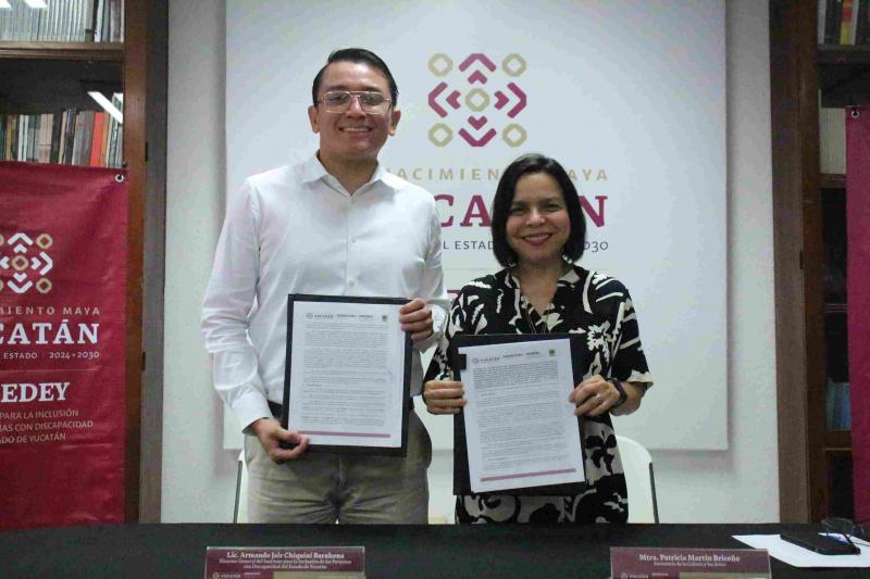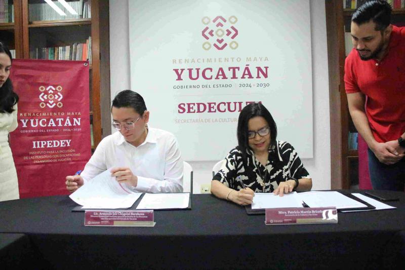 Mérida, Yucatán, a 23 de mayo de 2025.- En reconocimiento al acceso a las expresiones culturales como un derecho de toda la ciudadanía, la Secretaría de la Cultura y las Artes (Sedeculta) y el Instituto para la Inclusión de las Personas con Discapacidad del Estado de Yucatán (IIPEDEY), firmaron un convenio de colaboración para trazar estrategias y políticas de trabajo incluyentes.