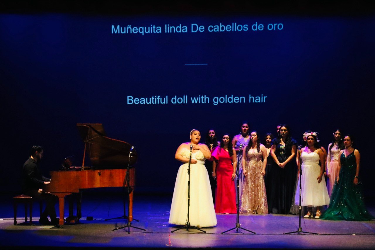 Los temas fueron interpretados por las educadas voces de Andrea Gutiérrez, Naomi Cuellar, Paola Parra, Mariana Palma, Claudia Carrillo, Andrés García, Martín Luna, Marcela Echeverría, Mariana Farfán, Teresa Canto, Andrea Poot y Graciela Gómez, que demostraron, una vez más, el talento vocal que hay en Yucatán.