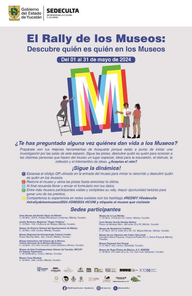 Finalmente, durante todo el mes de mayo, se llevará a cabo por tercer año consecutivo El Rally de los Museos, con el tema “Descubre quién es quién en los museos”, donde el público podrá visitar los espacios participantes de la Red de Museos de Yucatán (REDMY), y al escanear un código QR en la entrada del recinto, le permitirá acceder a la plataforma digital donde encontrará los desafíos que deberá ir completando para finalizar la dinámica.