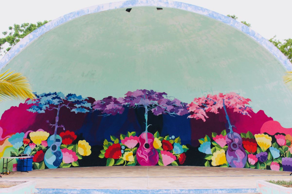 Asimismo, detalló que como el espacio donde elaboraron la pintura “es una concha acústica, mayormente, este es un lugar para hacer este tipo de eventos, donde se utilice la música, y las flores las quisimos poner en representación del traje típico de Yucatán, que es más o menos este tipo de flores que tiene bordadas”.