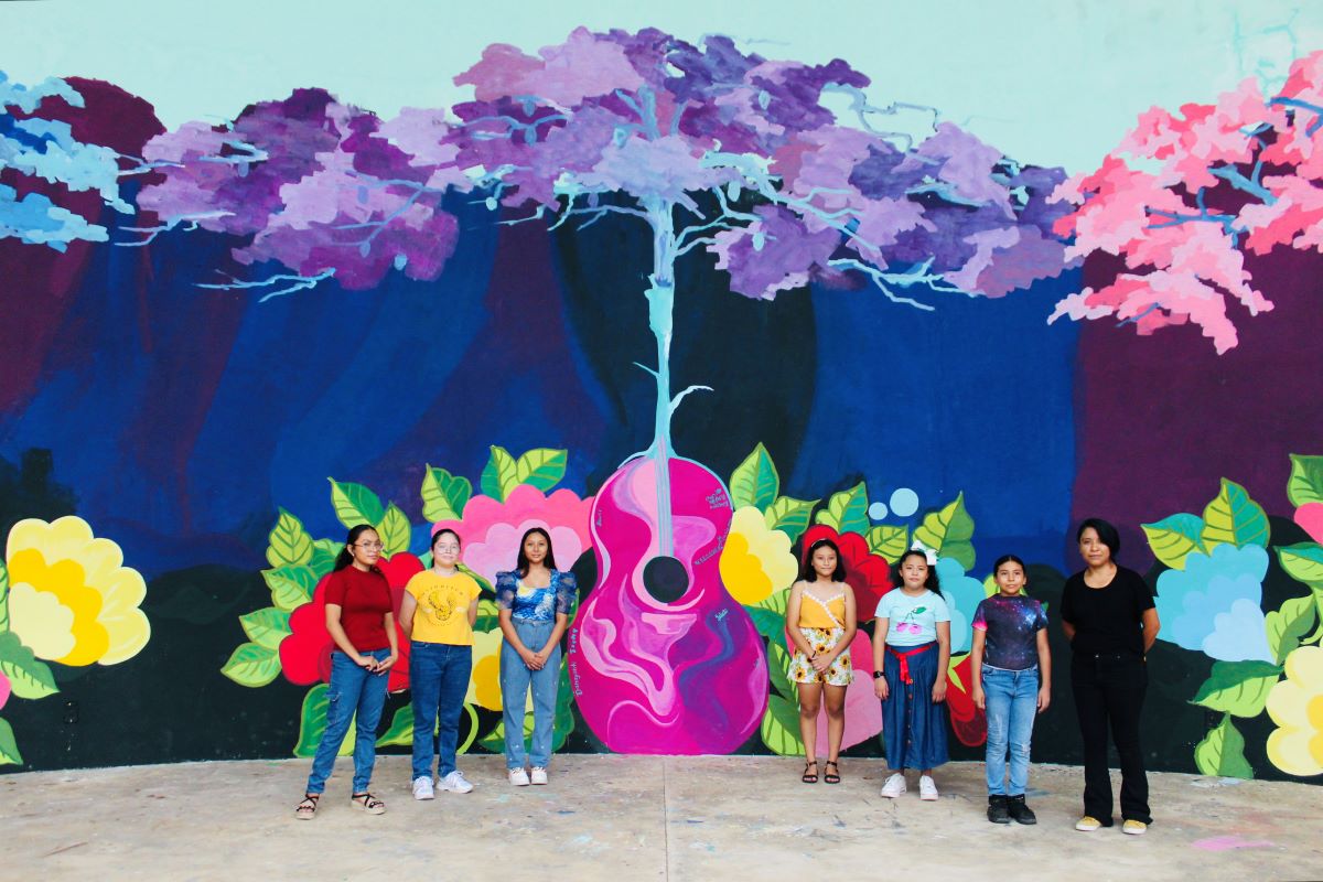 De este lugar, Carol Daniela Castro Tuz, explicó que tardaron un mes y medio en elaborar el lienzo a partir de un boceto que realizó la maestra Marlene Uh Canché y que las seis alumnas fueron enriqueciendo con sus opiniones para plasmar tres guitarras sobre flores y árboles lo que le generó orgullo a ella y sus compañeras.