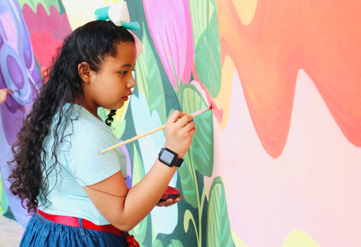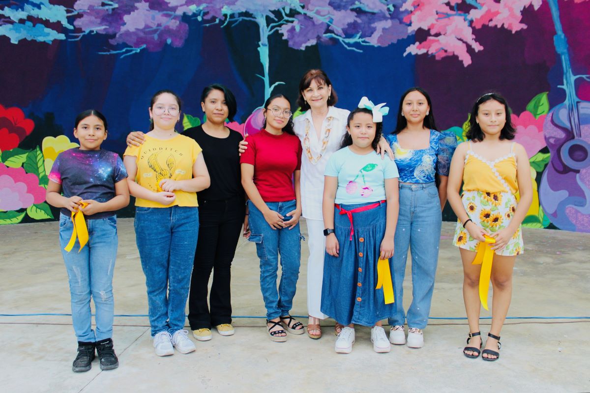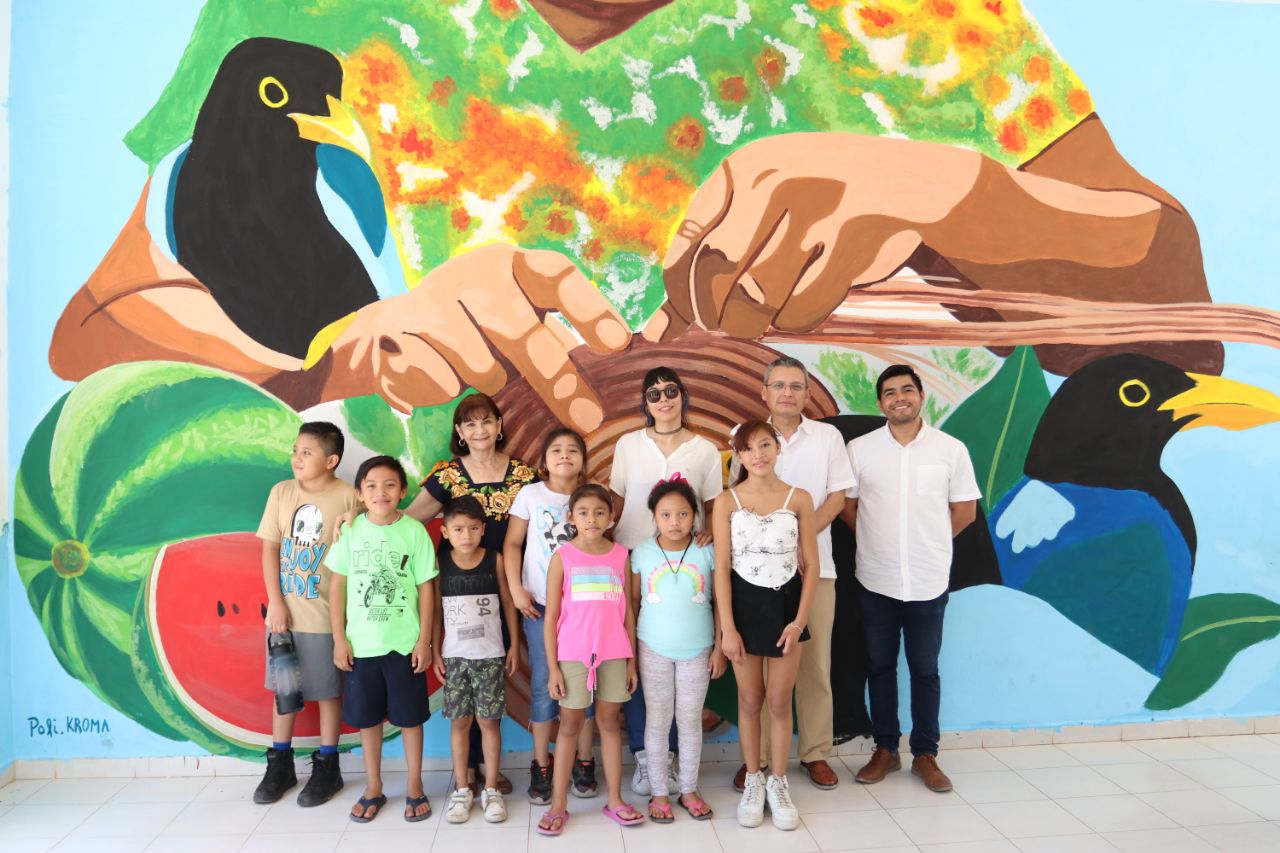 Buctzotz, Yucatán, 18 de junio de 2024.- La exploración del diálogo y las miradas de niñas y niños quedaron de manifiesto en el mural inaugurado en Buctzotz, obra pictórica del proyecto Arte, color y movimiento, parte de Alas y Raíces, programa que se realiza en Yucatán con el fin de fomentar la sensibilización artística.